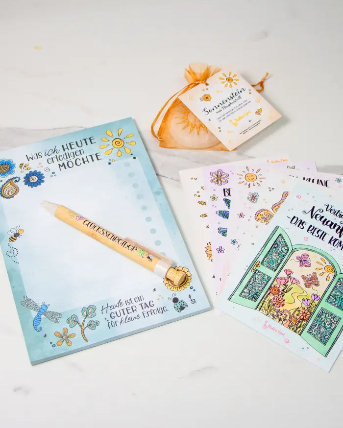 Wie das Glücksglas funktioniert: In diesem Glas findest du 4 kleine Blöcke - befülle sie… Dein Kaktus blüht zum allerersten Mal und du freust dich darüber? Du hast heute einen wunderschönen Sonnenuntergang erlebt? Ein Lob einer Kollegin hat dir heute ein Lächeln ins Gesicht gezaubert? Du bist dankbar für die Liebe, die dir eine ganz besondere Person schenkt? Schreibe deine Glücksmomente nieder. Täglich oder einfach dann, wenn dir danach ist. Im letzten Urlaub hast du eine Muschel am Strand gefunden oder ein herzförmiger Stein lag heute auf deinem Weg? Sammle auch diese Besonderheiten in deinem Glücksglas. Ebenso die Rechnung von einem unvergesslichen Restaurantbesuch oder die Eintrittskarte zum Konzert deiner Lieblingsband. Du wirst sehen, dieses Glas wird sich im Laufe der Zeit mit wahrem Glück füllen und deinen kunterbunten Lebensschatz beinhalten.