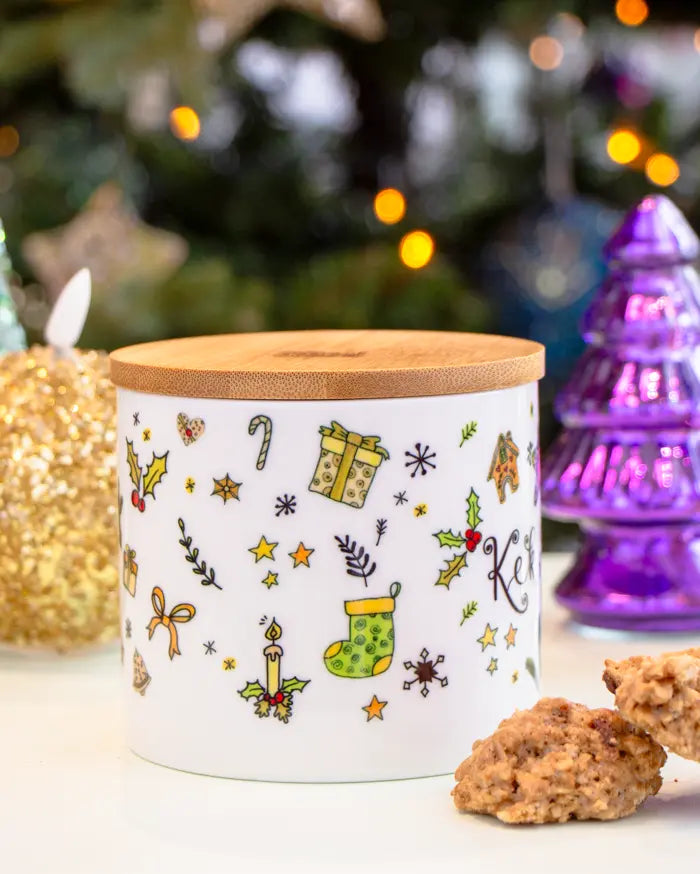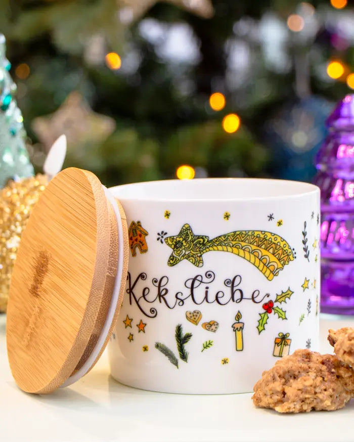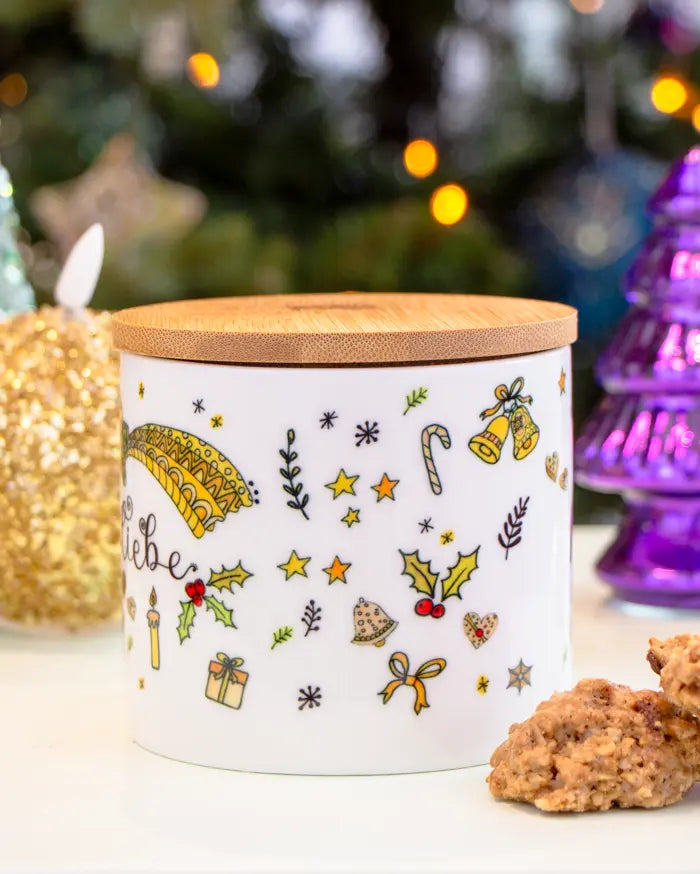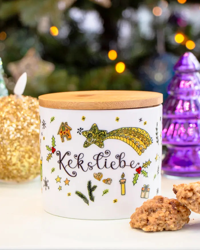 Die Keramikdose "Keksliebe" ist der ideale Platz für deine selbstgebackenen Weihnachtskekse – ob als süßer Hingucker in deiner Küche oder als liebevolles Geschenk für deine Lieblingsmenschen. Diese hochwertige Keramikdose mit glänzender Oberfläche und einem praktischen Bambusdeckel ist nicht nur wunderschön, sondern auch extrem funktional.