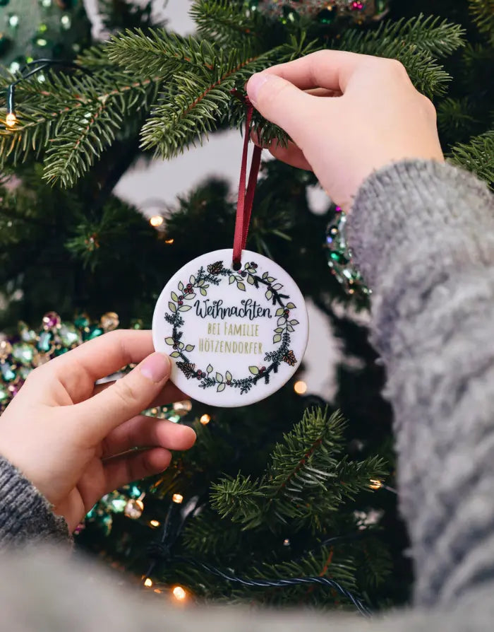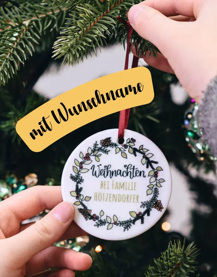 Mache das Weihnachtsfest noch persönlicher mit unserem Keramikhänger "Weihnachten bei Familie...", der mit dem Familiennamen personalisiert wird. Dieser einzigartige und liebevoll gestaltete Weihnachtsschmuck bringt Freude und wird schnell zum traditionsreichen Begleiter auf jedem Christbaum. Ob als Geschenk oder für den eigenen Baum – mit diesem Hänger wird die festliche Zeit noch zauberhafter.
