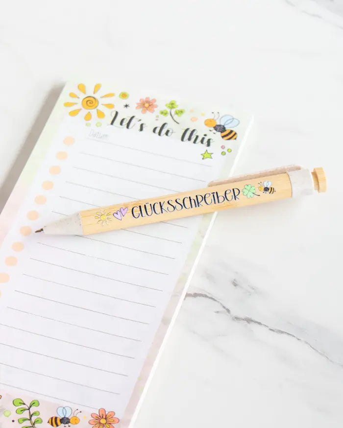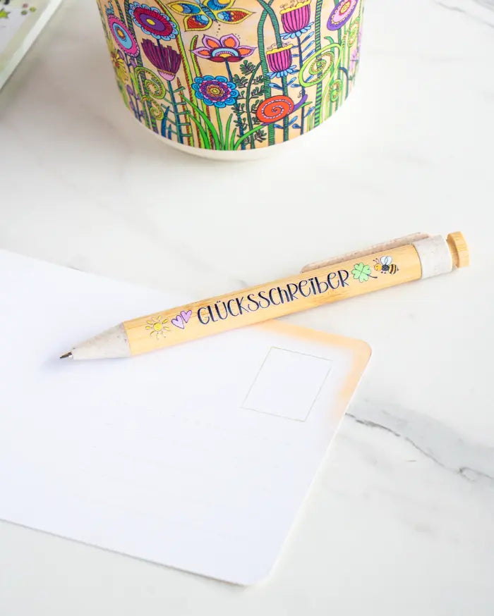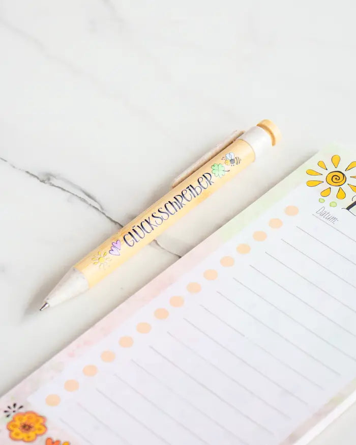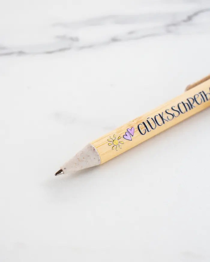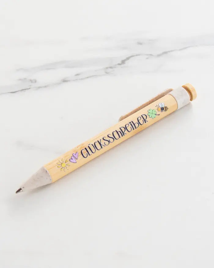 Mit unserem Glücksschreiber bringst du nicht nur deine Gedanken zu Papier, sondern trägst auch zu einer nachhaltigeren Welt bei. Der liebevoll bedruckte Druckkugelschreiber besteht aus einem Schaft aus Bambus sowie Details aus einem umweltfreundlichen Gemisch aus Weizenstrohhalm- und PP-Kunststoff (je 50%). Die Kombination aus Nachhaltigkeit und Stil macht ihn zu einem perfekten Alltagsbegleiter – ob für Notizen, kreative Ideen oder Glücksbotschaften.