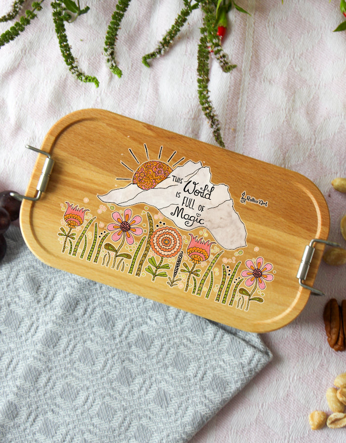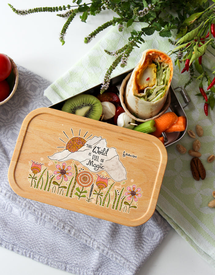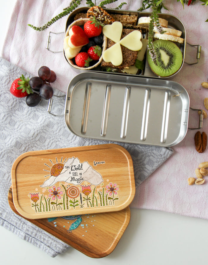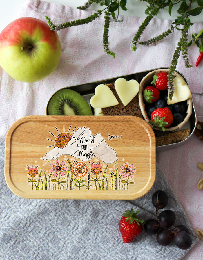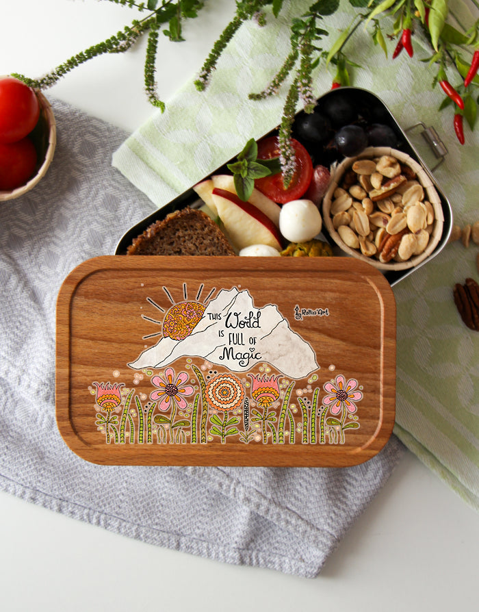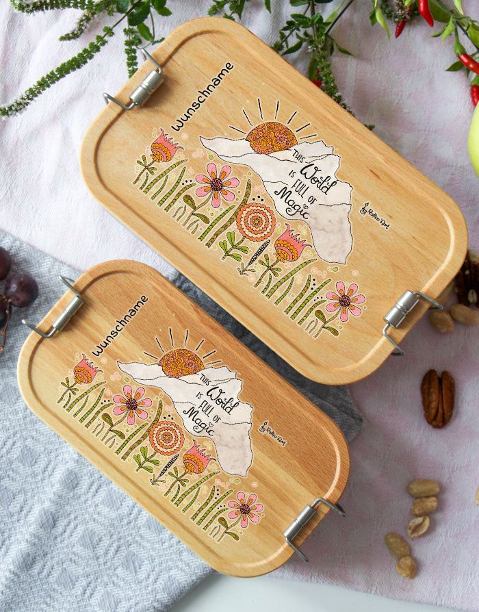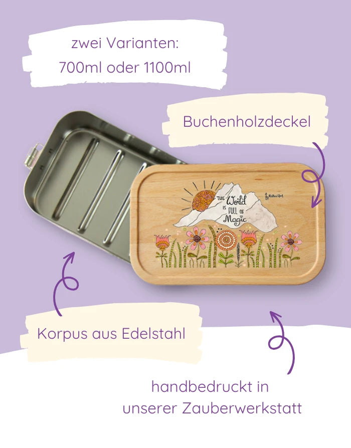 Mach deine Lunchbox zu etwas Besonderem: Der Deckel kann mit deinem Wunschnamen personalisiert werden. Jedes Motiv wird mit Liebe per Hand gezeichnet und in unserer Zaubermanufaktur in Tirol bedruckt – so wird jede Box zum Unikat.