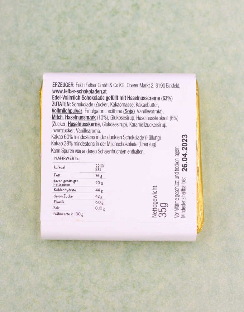 Zutaten: Schokolade (Zucker, Kakaomasse, Kakaobutter, Vollmilchpulver, Emulgator: Lecithine [Soja], Vanilleextrakt), Milch, Haselnussmark (10%), Glukosesirup, Haselnusskrokant (6%) (Zucker, Haselnusskerne, Glukosesirup), Karamellzuckersirup, Invertzucker, Vanillearoma.