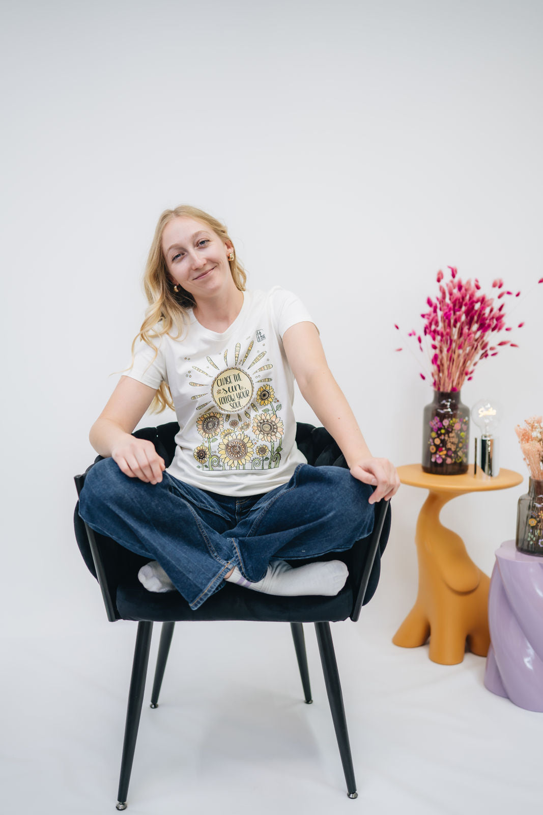 Bring Sonne und Lebensfreude in deinen Alltag – mit dem Damen T-Shirt „Chase the sun, follow your soul“. Der verspielte Print mit strahlender Sonne und Sonnenblumen erinnert dich daran, deiner inneren Stimme zu folgen und die schönen Momente zu genießen.