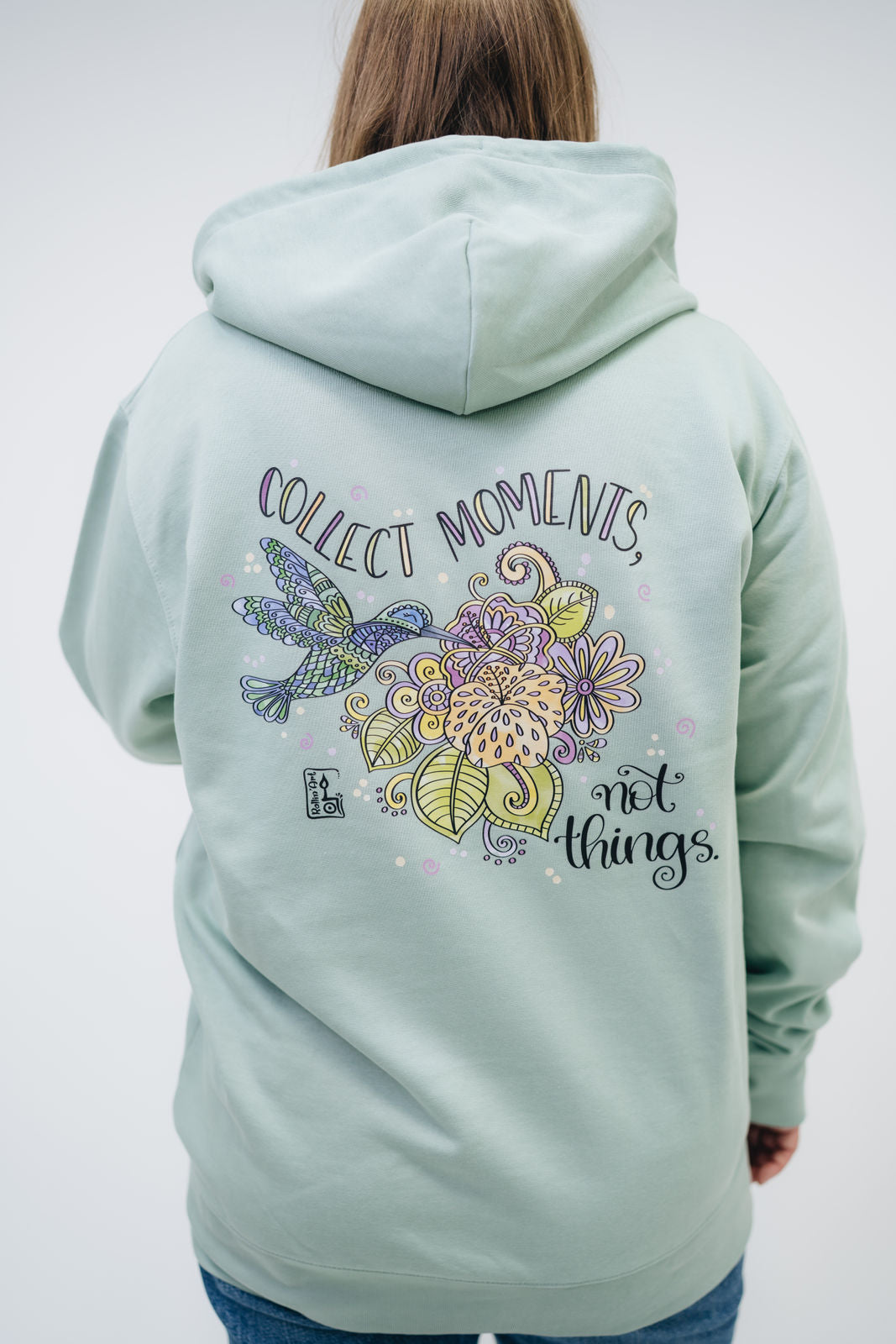 - Print: Kolibri und Blumen (Beust und Rücken), Schriftzug "Collect moments, not things."