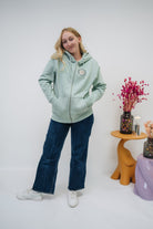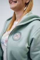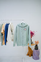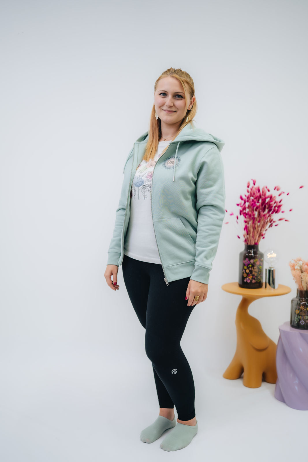 Gefertigt aus 100 % Bio-Baumwolle (350 g/m², GOTS-zertifiziert), überzeugt der Hoodie durch seine hohe Qualität: aufgeraute Innenseite, gefütterte Kapuze, robuster Metallreißverschluss und Kängurutaschen. Das frische Mintgrün sorgt für einen modernen, sanften Look – perfekt zum Entspannen, für Yoga, Freizeit und Reisen.
