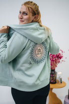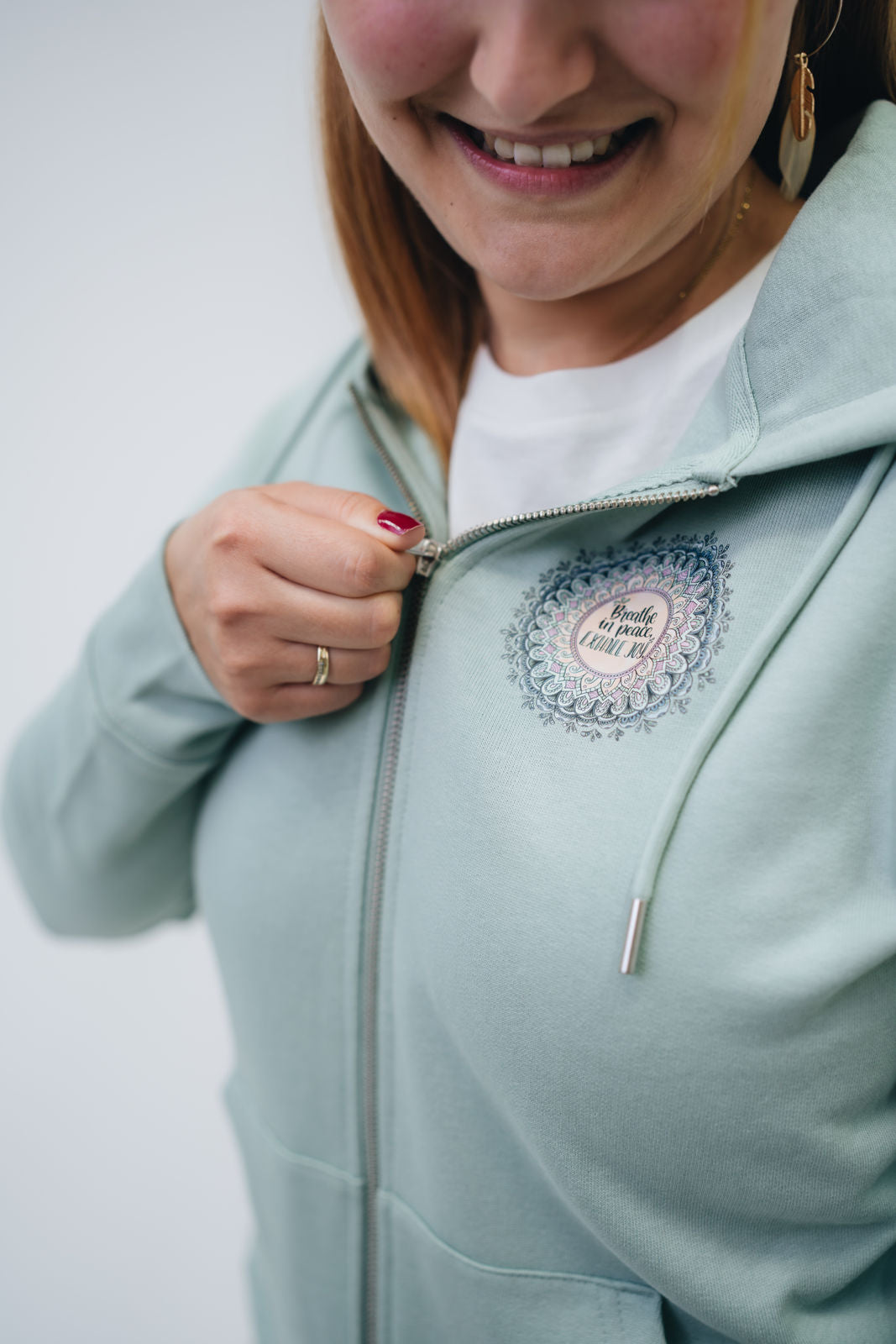 Atme tief durch und finde deine innere Balance – mit unserem Zipper Hoodie „Mandala“. Auf der Brust sowie auf der Rückseite prangt ein detailreiches Mandala-Design in sanften Pastelltönen, kombiniert mit der inspirierenden Botschaft „Breathe in peace, exhale joy“. Ein Hoodie, der dich an deine Stärke erinnert und Ruhe in deinen Alltag bringt.