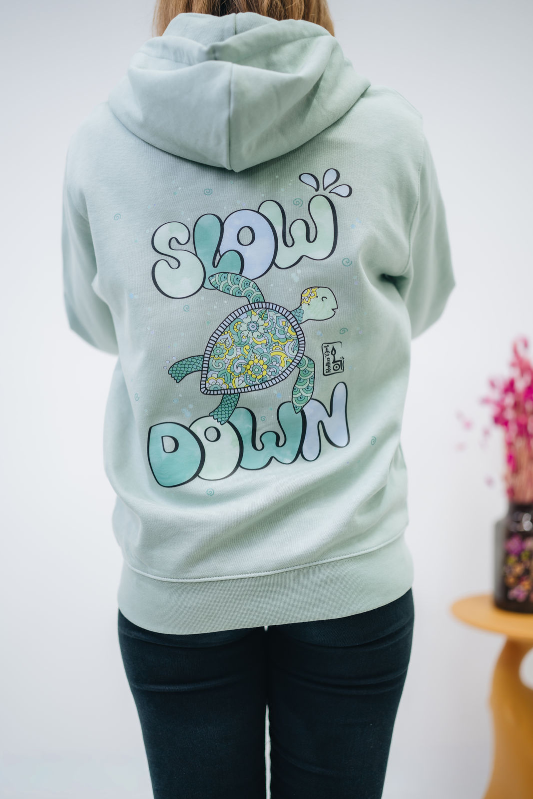 - Print: Handgezeichnete Schildkröte und Schriftzug "Slow down"