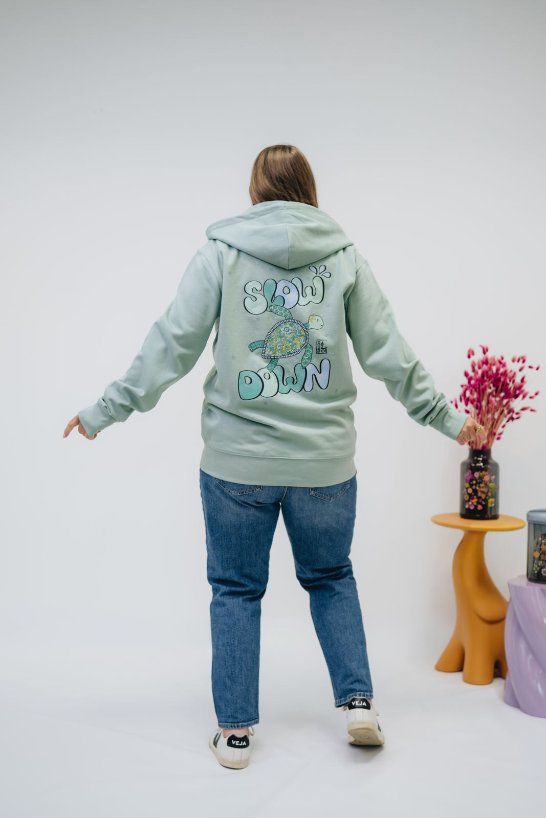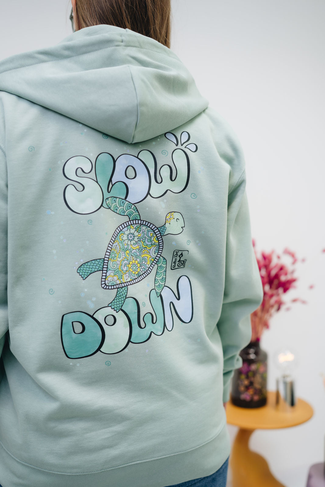 Manchmal ist weniger mehr – und genau daran erinnert dich unser Damen Zipper Hoodie „Slow Down“. Das liebevoll illustrierte Motiv zeigt eine Schildkröte mit floralen Mustern und den handgezeichneten Schriftzug „Slow Down“. Ein Statement für Achtsamkeit, Entschleunigung und ein bewussteres Leben.