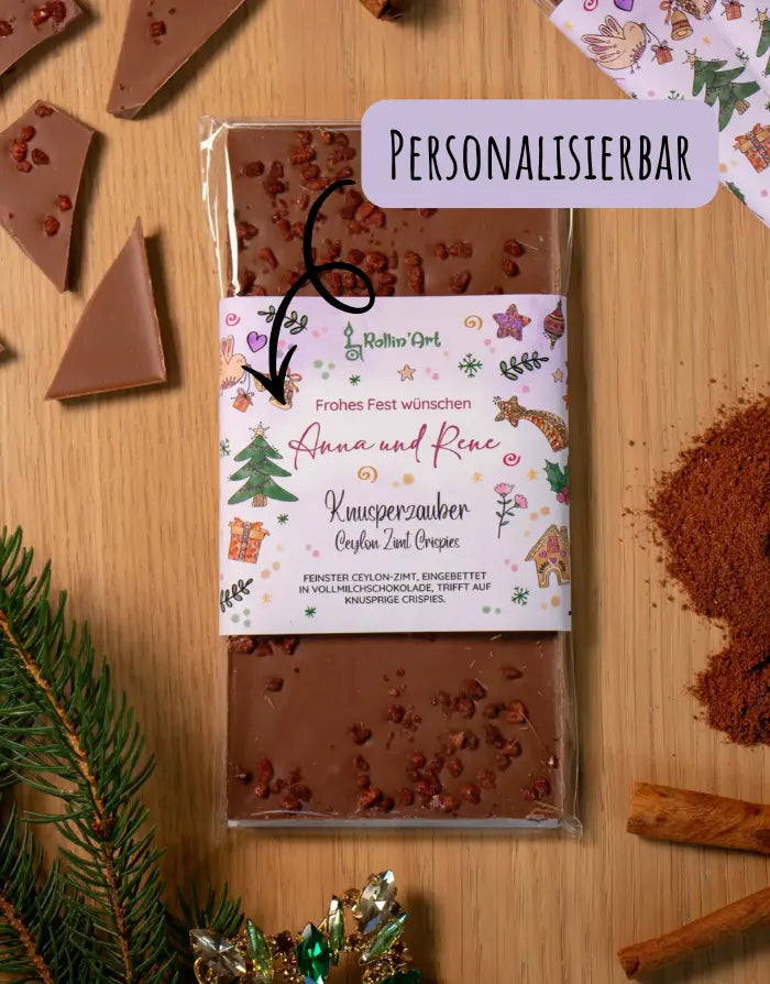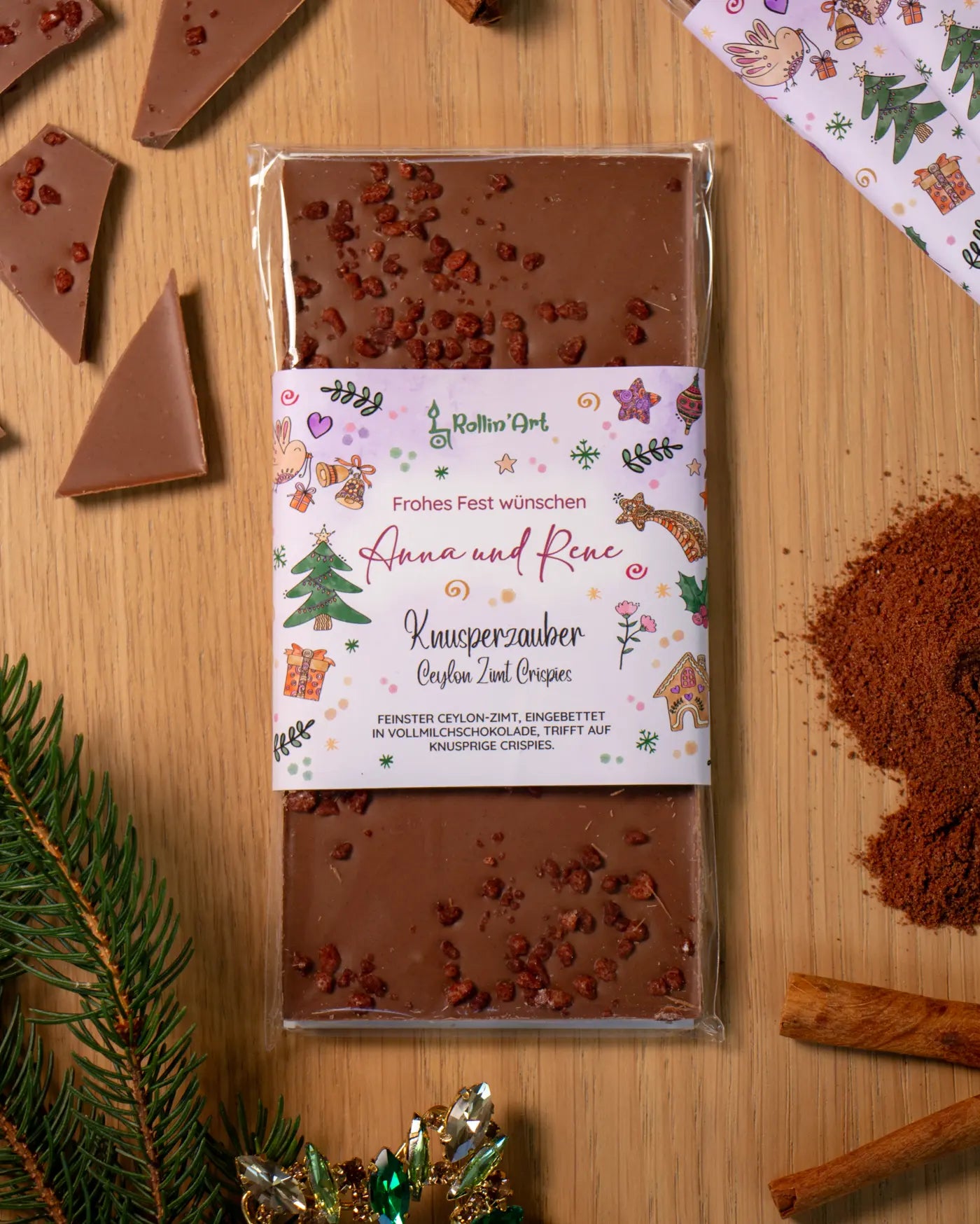 Highlight: Auf Wunsch personalisieren wir die Banderole. So wird diese Schokolade zu einem ganz persönlichen Weihnachtsgruß.