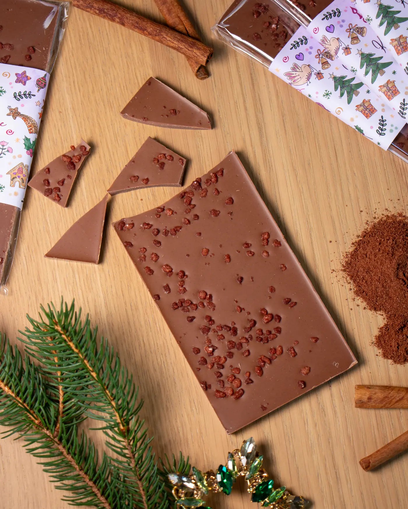 Diese handgeschöpfte Vollmilchschokolade bringt den Zauber der Winterzeit direkt auf die Zunge. Feinster Ceylon-Zimt verleiht der Tafel eine warme, aromatische Würze, während knusprige Crispies für den typischen „Knuspermoment“ sorgen – perfekt für gemütliche Abende und kleine Genussrituale.
