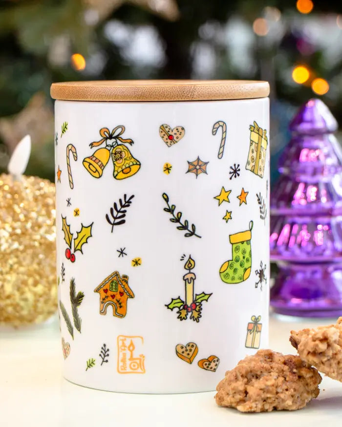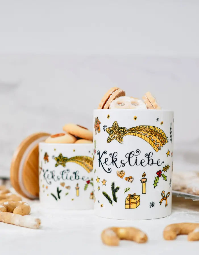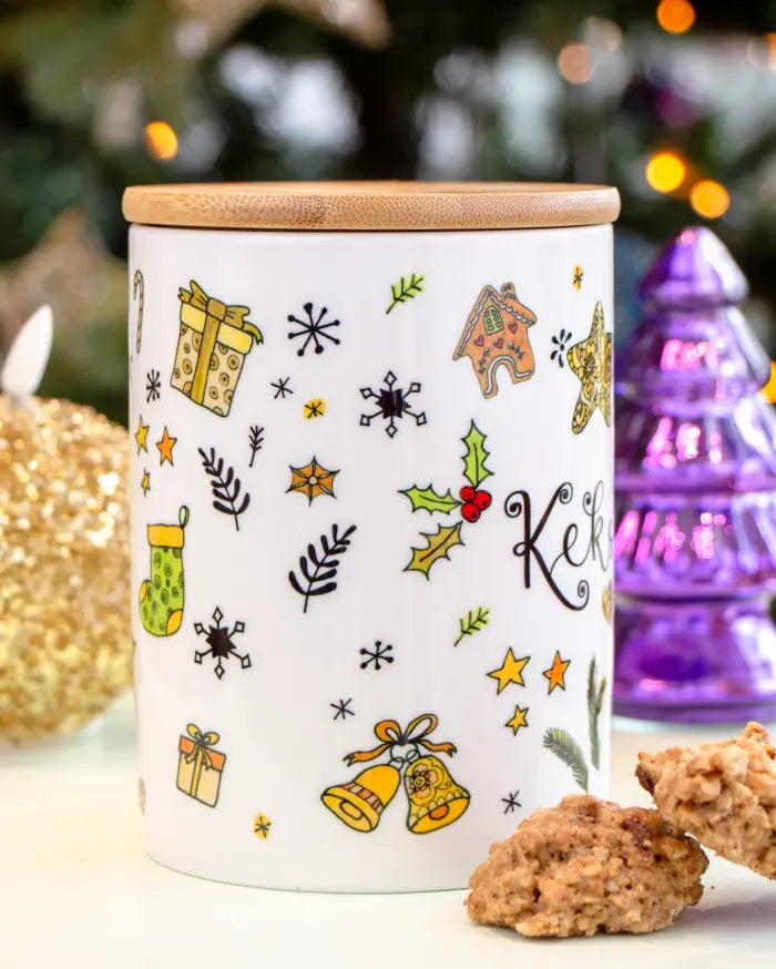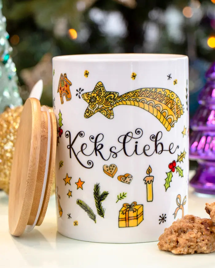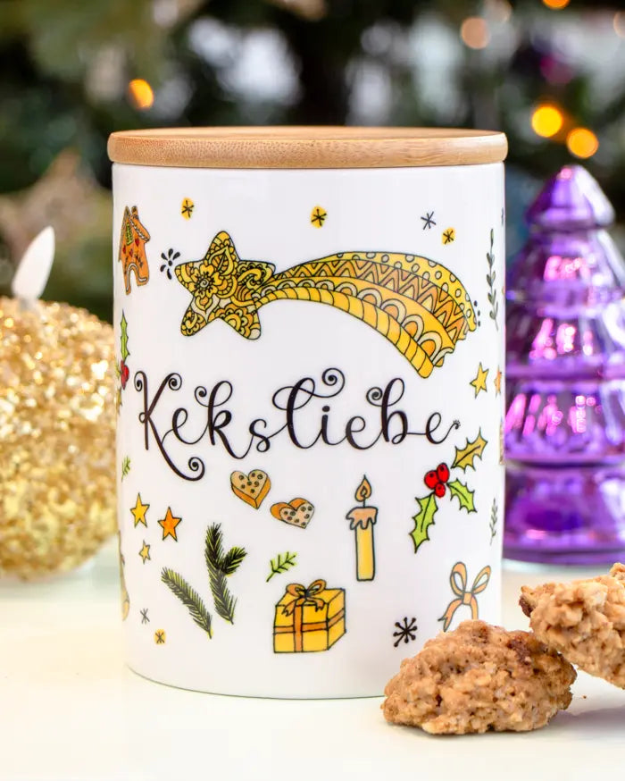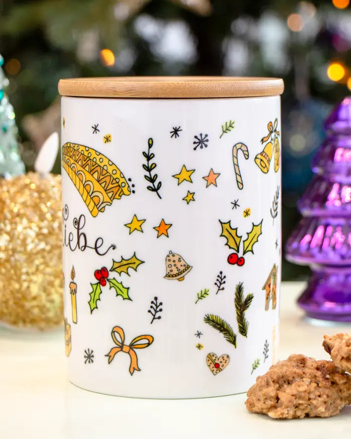 Die Keramikdose "Keksliebe" ist der ideale Platz für deine selbstgebackenen Weihnachtskekse – ob als süßer Hingucker in deiner Küche oder als liebevolles Geschenk für deine Lieblingsmenschen. Diese hochwertige Keramikdose mit glänzender Oberfläche und einem praktischen Bambusdeckel ist nicht nur wunderschön, sondern auch extrem funktional.