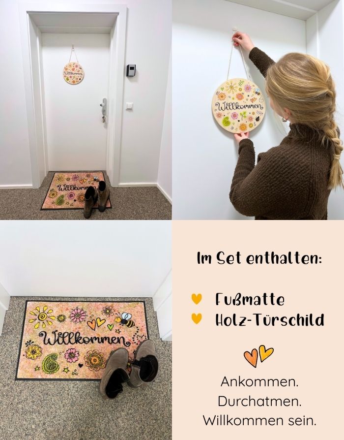 Unser liebevoll gestaltetes Willkommen-Zuhause-Set sorgt schon vor der Haustür für ein warmes Gefühl. Die hochwertige Fußmatte trifft auf ein herzliches Holz-Türschild – funktional, langlebig und mit ganz viel Charme.
