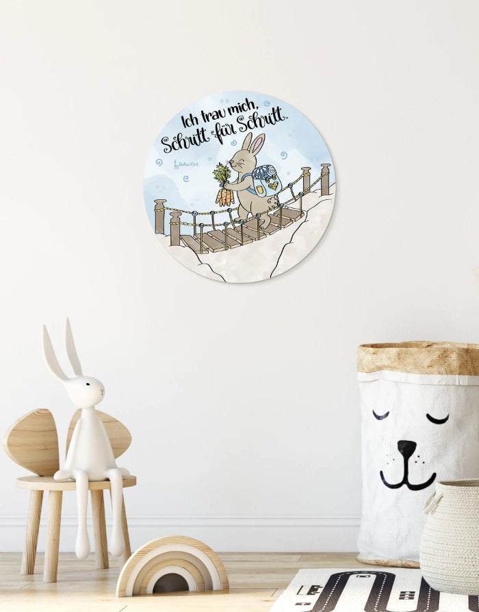 Der kleine Hase mit Rucksack steht für Mut, Vertrauen und den Glauben daran, dass jeder Weg mit einem Schritt beginnt – ganz egal, wie klein er ist.