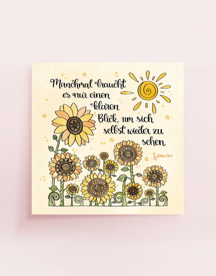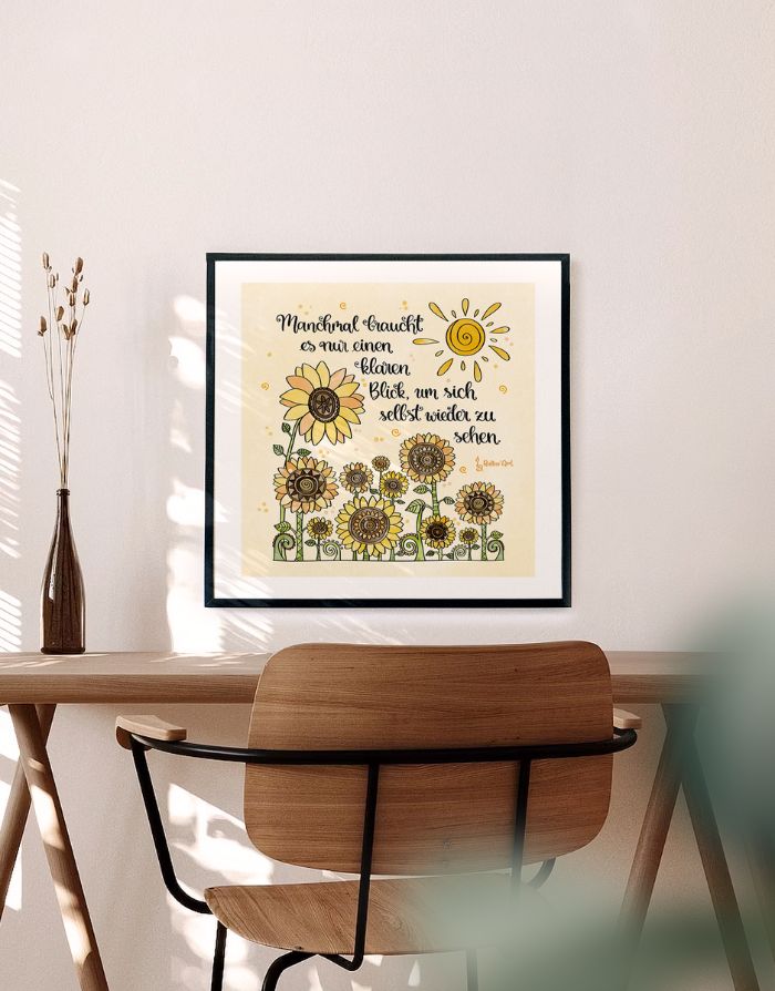 Die strahlenden Sonnenblumen stehen für Klarheit, Wachstum und innere Stärke. In Kombination mit der warmen Farbwelt und der sanften Botschaft entsteht ein Kunstdruck, der Ruhe schenkt und gleichzeitig Mut macht. Ideal für Wohnräume, Schlafzimmer, Praxisräume oder dein Homeoffice – überall dort, wo du dir einen Moment der Achtsamkeit wünschst.