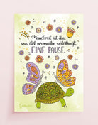 Dieses liebevoll illustrierte Poster erinnert dich daran, dir selbst Zeit zu schenken, durchzuatmen und den eigenen Rhythmus zu achten. Die sanfte Schildkröte steht für Gelassenheit und Beständigkeit, die Schmetterlinge für Leichtigkeit und neue Perspektiven – eine wunderbare Kombination aus Ruhe und Zuversicht.
