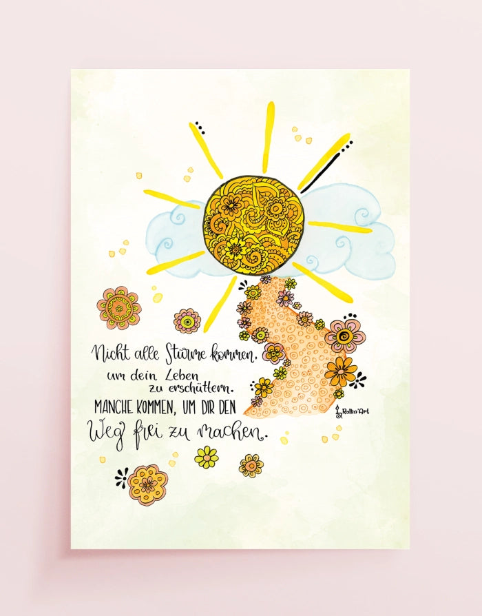 Dieses liebevoll illustrierte Poster erinnert dich daran, dass herausfordernde Zeiten oft der Beginn von Veränderung sind. Die strahlende Sonne, die sich ihren Weg durch die Wolken bahnt, steht für Hoffnung, Vertrauen und die Zuversicht, dass nach jedem Umbruch wieder Licht folgt.