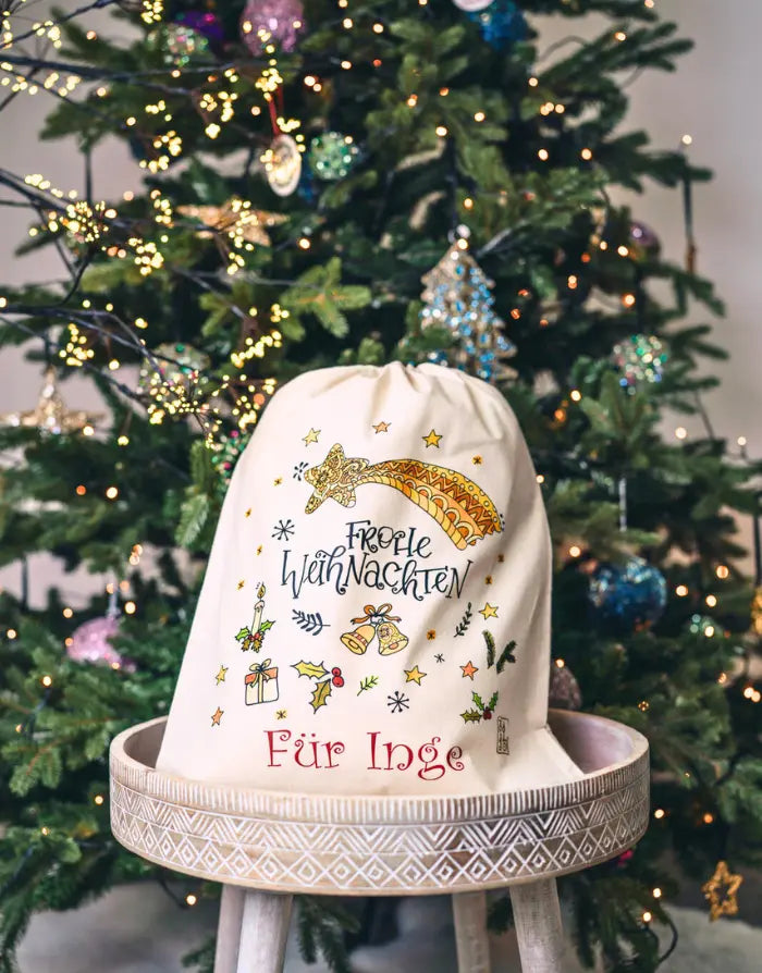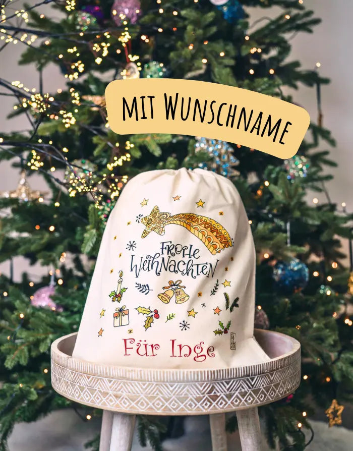 • Design: Handbedruckt mit einem festlichen Weihnachtsmotiv, personalisierbar mit deinem Wunschnamen