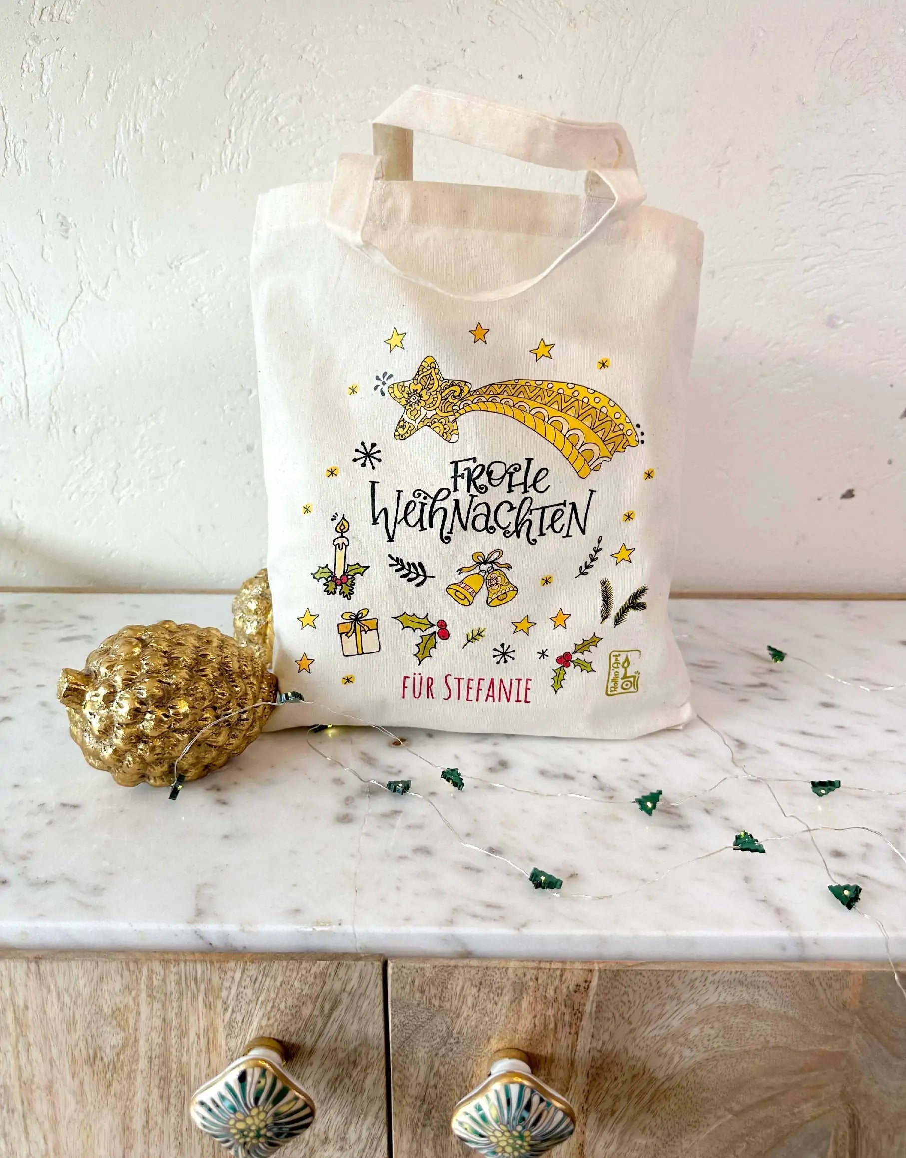 Unsere zauberhafte Geschenktasche "Frohe Weihnachten" mit Wunschname ist die perfekte Möglichkeit, Geschenke auf eine liebevolle, persönliche und umweltfreundliche Weise zu verpacken. Jede Tasche wird in unserer Rollin'Art Zauberwerkstatt mit einem handgezeichneten Motiv bedruckt und ganz individuell mit deinem Wunschnamen versehen – mit viel Liebe aus Tirol!