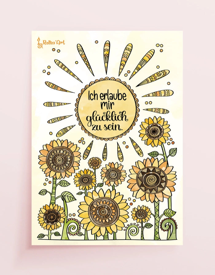 This cheerful poster with radiant sunflowers and warm sunshine lovingly reminds you to consciously embrace happiness. With its harmonious colors, it brings lightness, warmth, and good cheer into your home – ideal as a gift or a personal pick-me-up.