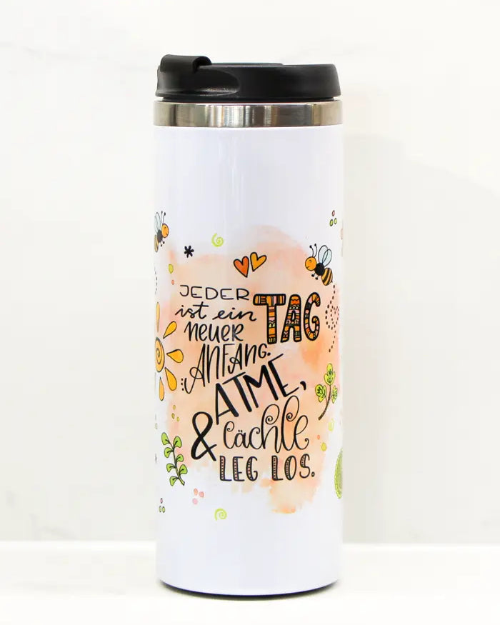 Ob Thermoflaschen, Glasflaschen, Edelstahl-Thermobecher, Thermo Cups oder besondere Becher für Kinder – jedes Produkt wird mit viel Herz ausgewählt und gestaltet. Die Motive entstehen in liebevoller Illustration und bringen Farbe, Leichtigkeit und Freude in deine Pausen.