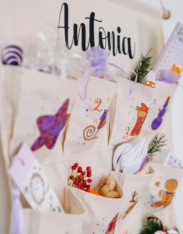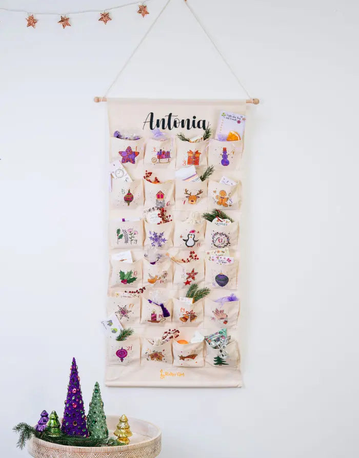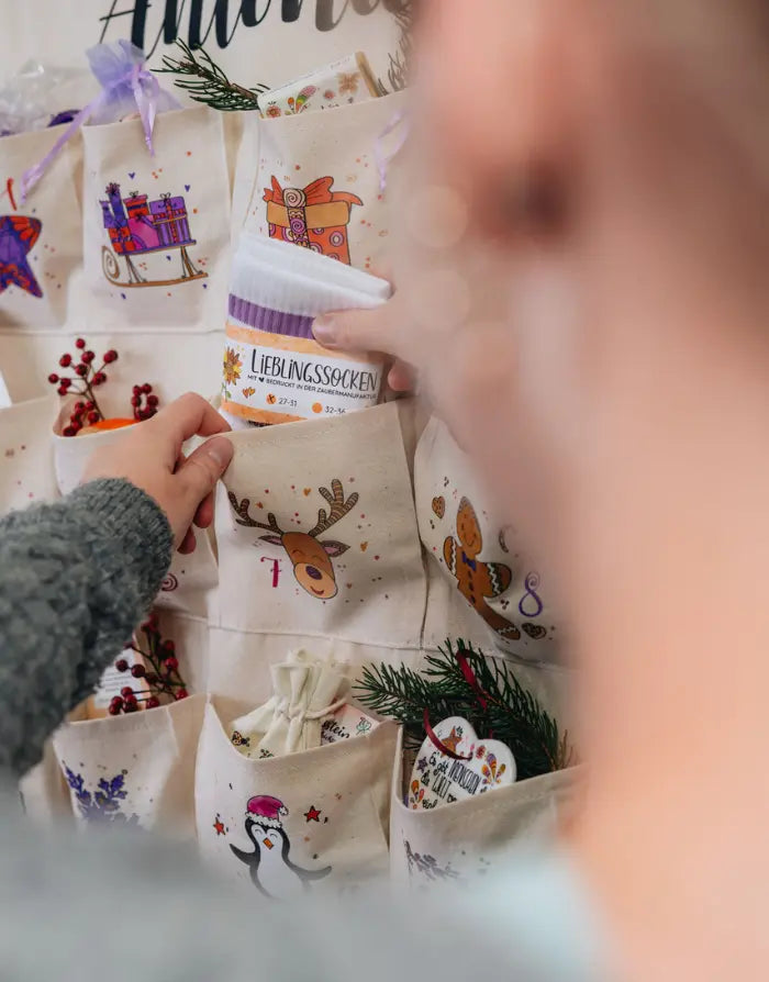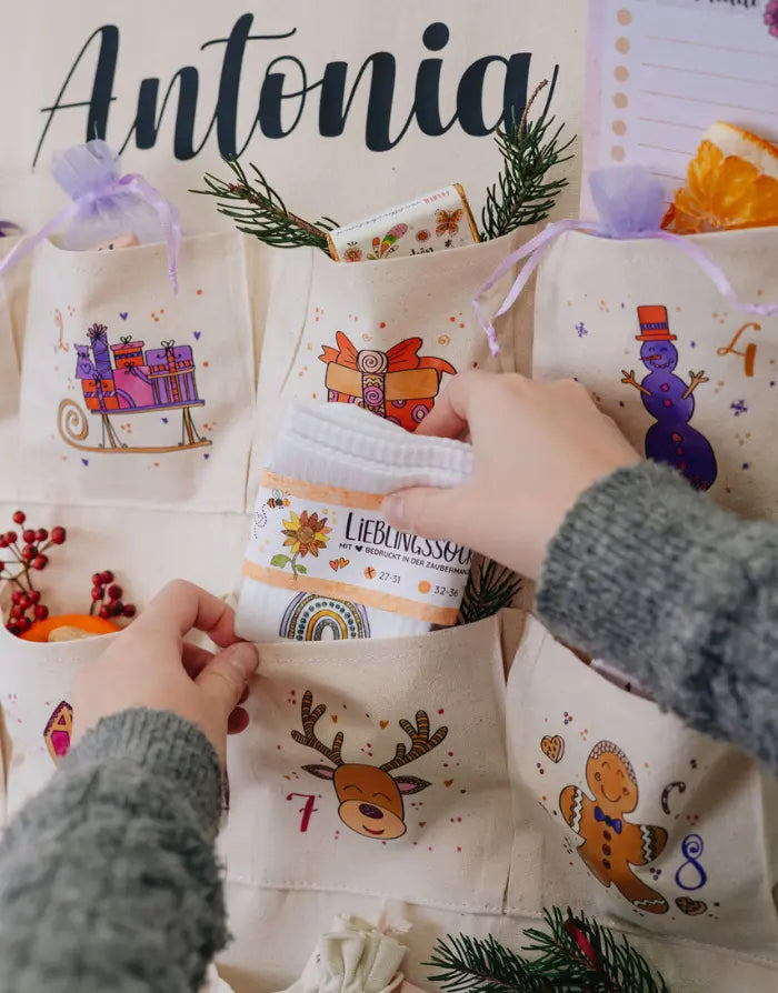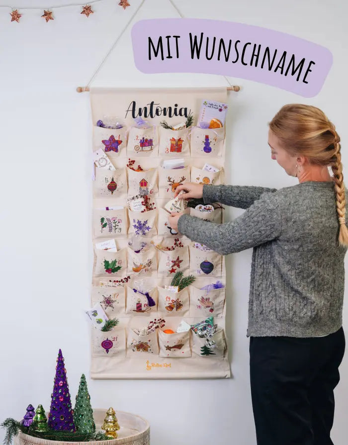 Mit unserem personalisierbaren Adventskalender wird die Vorweihnachtszeit zu einem ganz besonderen Erlebnis. Bedruckt mit zauberhaften, handgezeichneten Motiven in unserer Rollin'Art Zaubermanufaktur, sorgt der Adventskalender nicht nur für leuchtende Augen, sondern ist auch eine wundervolle Dekoration für die Weihnachtszeit. Die 24 großen Fächer bieten viel Platz für kleine Überraschungen und Geschenke. Der Adventskalender ist aus hochwertigem Baumwollstoff gefertigt, langlebig und nachhaltig, sodass er Jahr für Jahr immer wieder Freude bereiten kann.